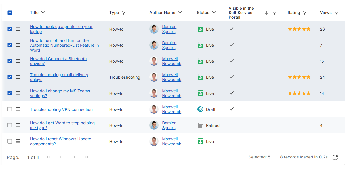 In short, a Knowledge Base article is available on the Self Service Portal only if it is published (visible) and in a Live status. The screenshot below illustrates this concept: only the 5 articles out of 8 that meet these criteria are highlighted.